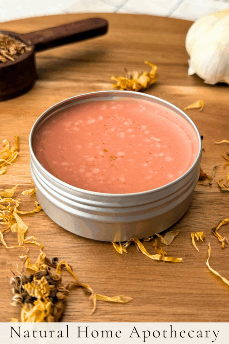 The garlic oil is the most fragile part. If you infused olive oil yourself using fresh garlic, you’ll want to keep the salve in the fridge and use it within 4 to 6 months just to be safe. Fresh garlic in oil can carry a very rare risk of botulism if stored at room temperature for too long. If you bought a shelf-stable infused oil like this one, it will last on the longer end.